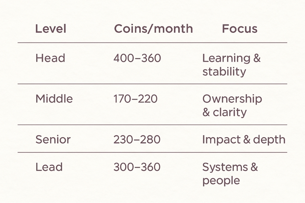 Coins help visualise how responsibility, impact, and learning scope expand from one level to another.